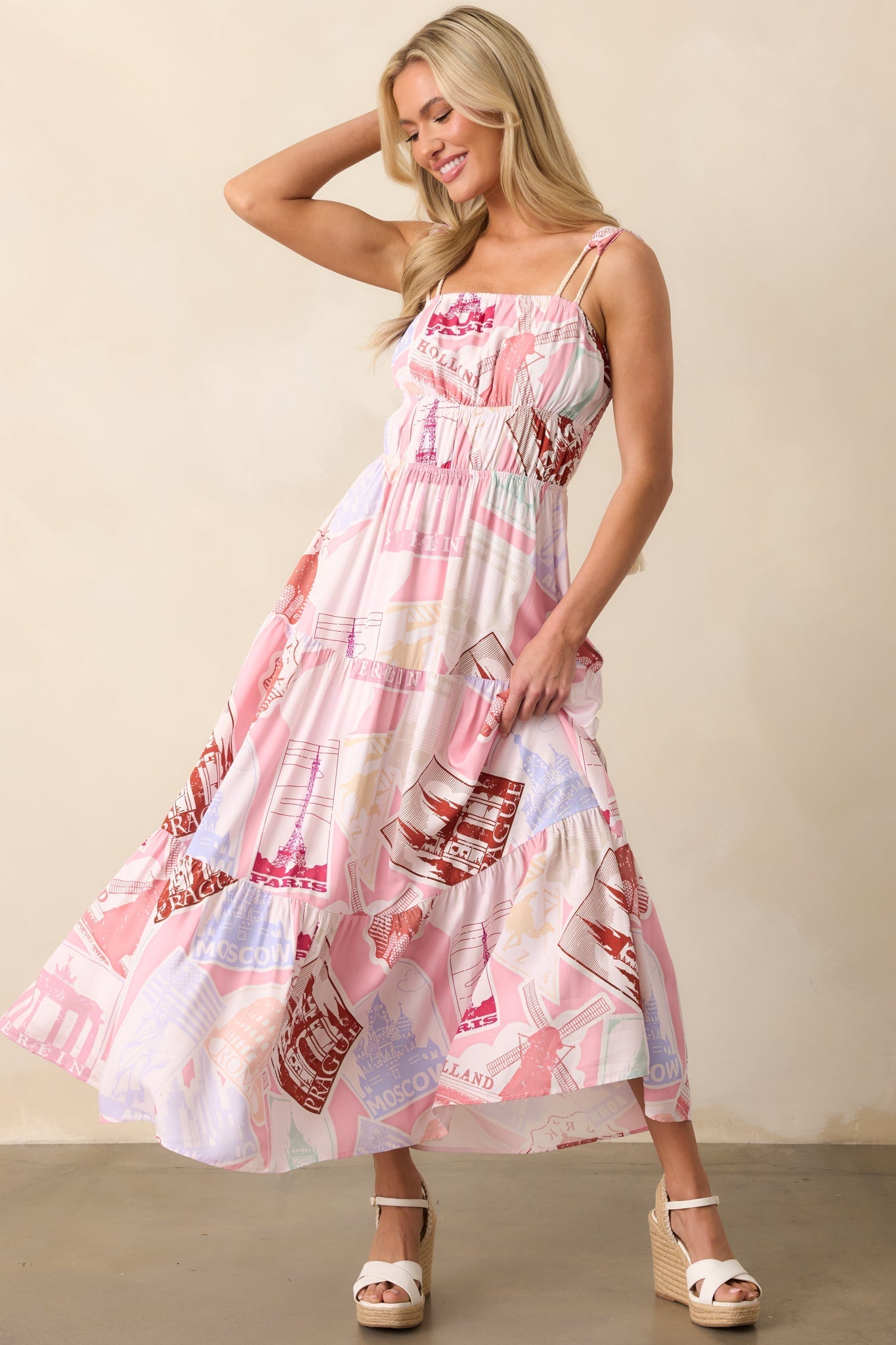 The Adair Passport To The Sun Pink Midi Dress is a captivating choice for embracing the warmth and adventure of sunny days. It's perfect for those moments when you want to feel vibrant and stylish, with a sense of freedom that makes every day feel like a journey to new horizons. This pink midi dress features an exclusive Prosperina multicolor passport-inspired print, elastic square neckline, adjustable self-tie rope tassel straps, smocked back panel, elastic waistbands, and a tiered skirt.