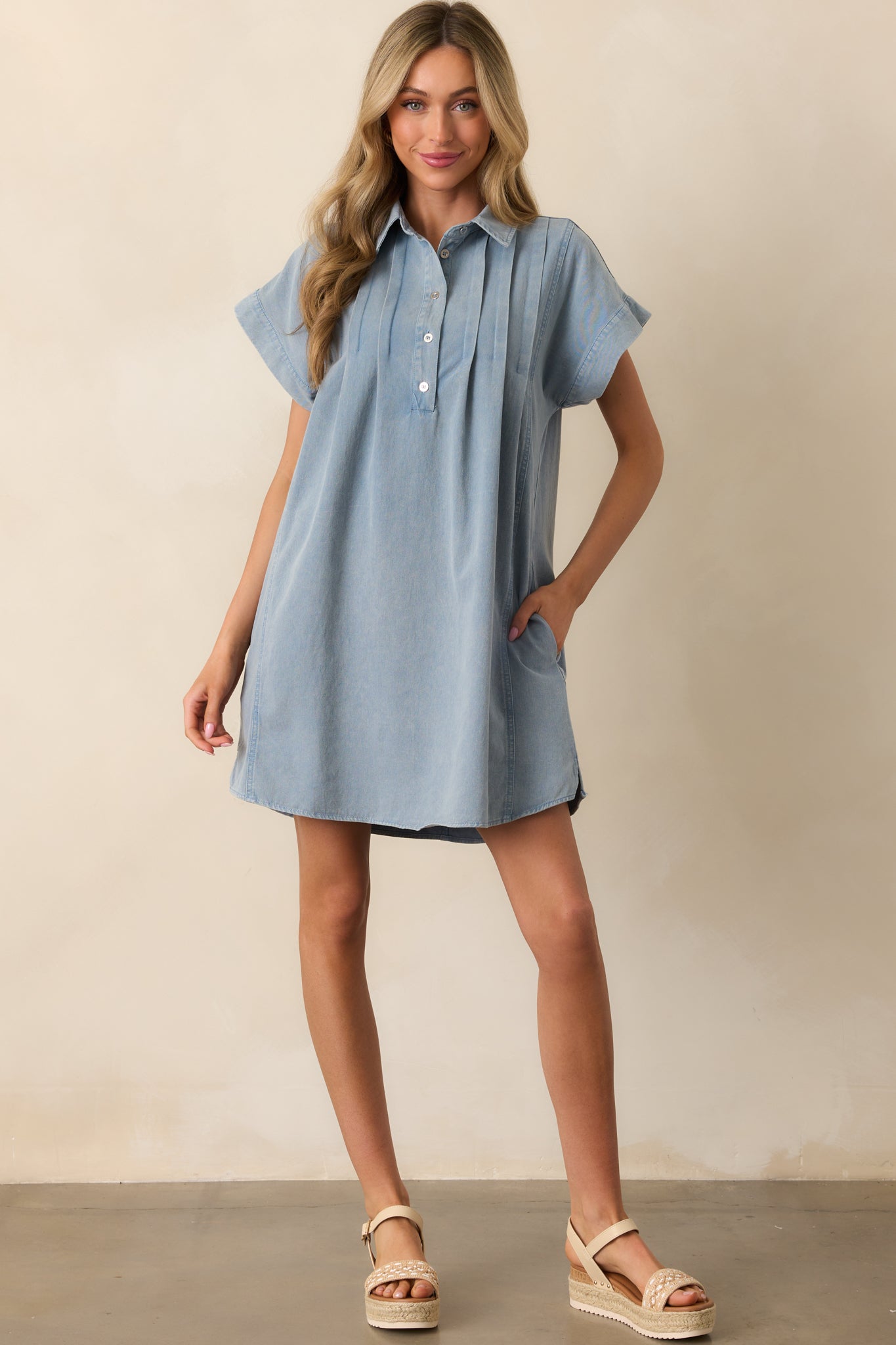 The Perfect Afternoon Light Wash Short Sleeve Denim Mini Dress is made for easygoing days and carefree moments. With its relaxed feel and timeless charm, it’s the perfect throw-on-and-go piece for soaking up the sunshine. This light wash mini dress features a 100% cotton denim fabric, collared neckline, functional 1/4 button front, short sleeves, pin tuck detailing, and functional pockets.