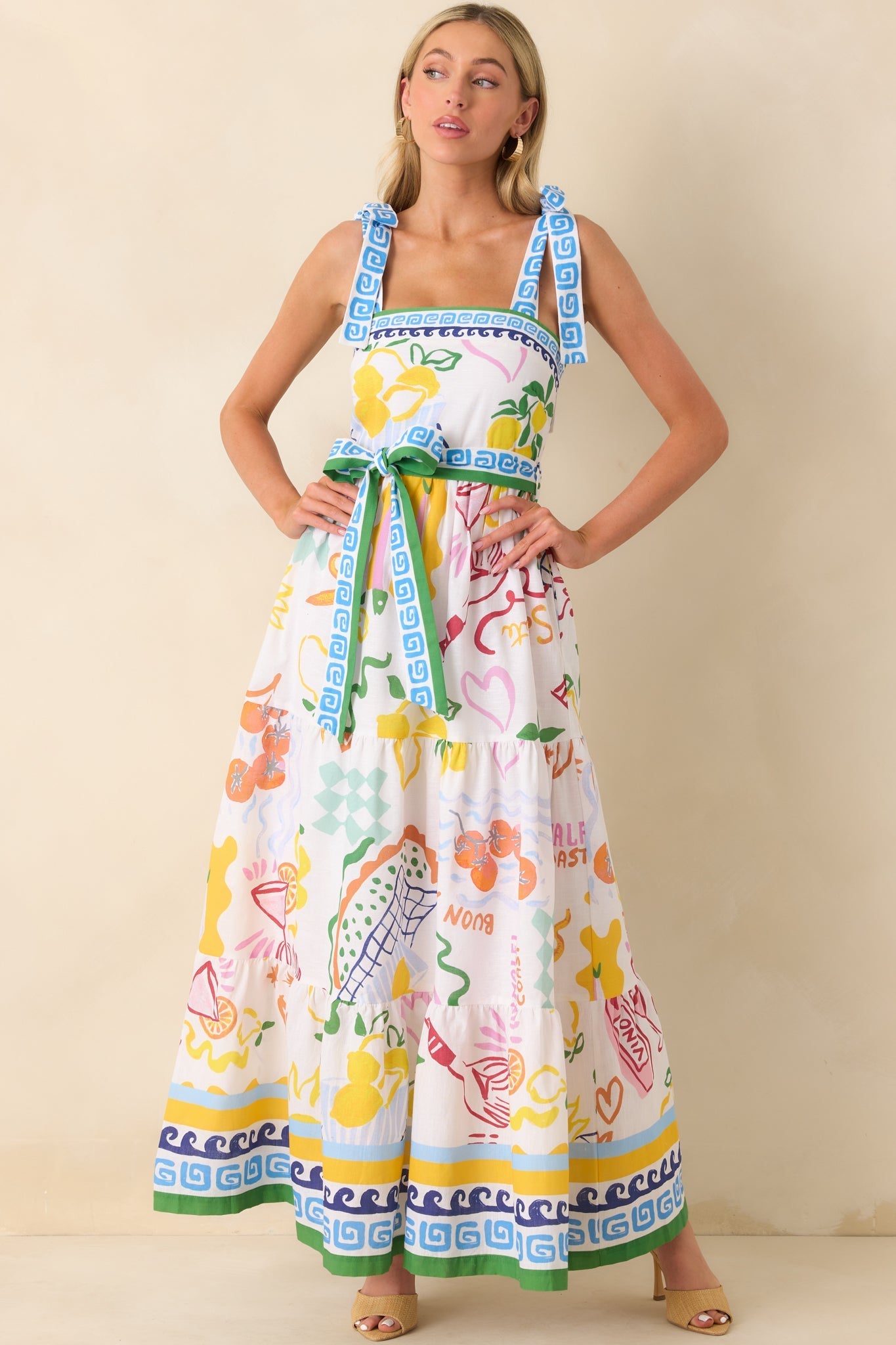 The Prosperina Gemma Multi Print Linen Blend Maxi Dress sweeps you into a mood of easy elegance and vibrant spirit. Its flowing silhouette and lively mix of colors make it the ideal choice for sunset dinners, garden parties, or any occasion where you want to stand out while feeling completely at ease. This maxi dress features an exclusive Prosperina Summer Spritz multicolor print, square neckline, adjustable self-tie bow straps, back smocked panel, hidden back zipper, belt loops, optional self-tie belt, white lining, and functional pockets.