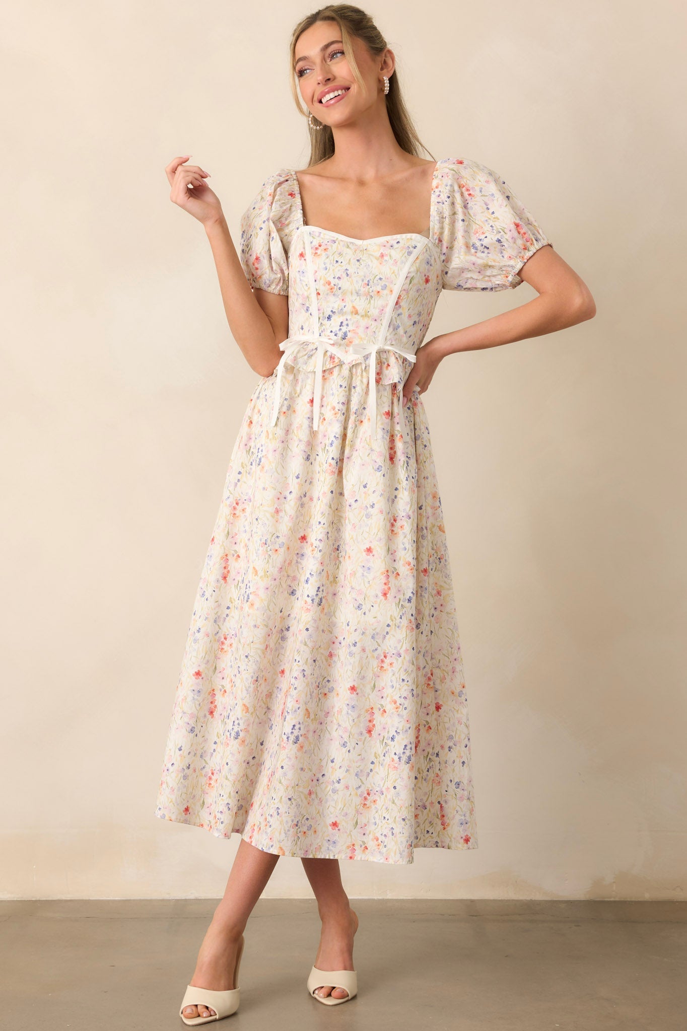 Indulge in effortless elegance with the Safe Haven Ivory Cotton Floral Midi Dress! Made from soft and breathable cotton, this dress features a beautiful floral print that adds a romantic touch. The midi length offers versatility for any occasion, while the comfortable fit ensures all-day wear. Perfect for a chic and feminine look! This ivory dress features a sweetheart neckline, short puff sleeves, two functional front bows, a smocked back, and a ruffle waist.