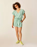 Skip, prance, and bound with reckless abandon with this radical romper. Designed with joy in mind, we gave her a relaxed fit, V-neck, elastic WB with double drawcord, and a back keyhole for good measure.