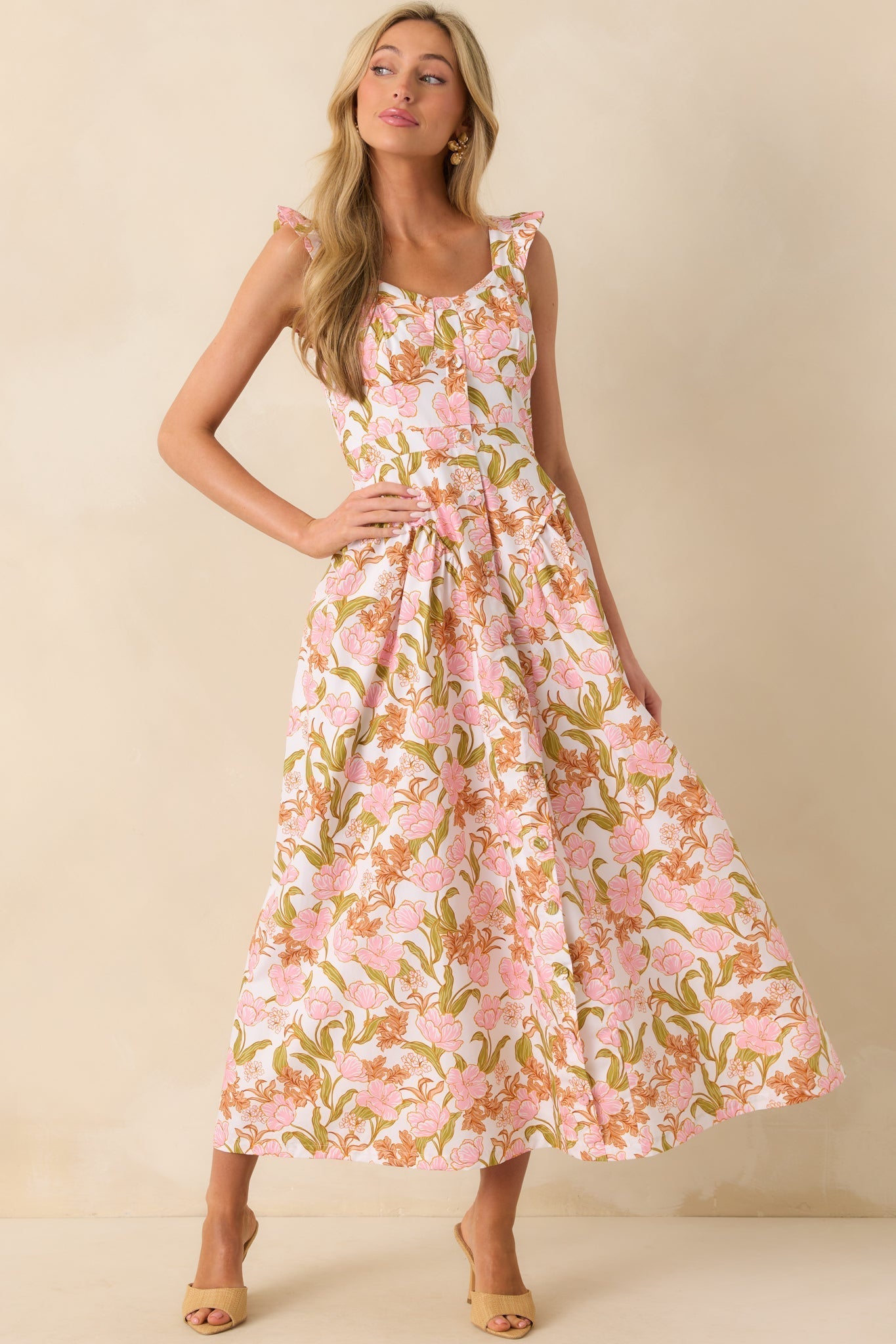 The Main Event Pink Floral Print Cotton Maxi Shirt Dress is made for those days when your calendar’s a little fuller—baby showers, brunches, garden parties and everything in between. Polished without feeling overdone, it’s the piece that makes getting ready the easiest part. This maxi dress features a pink floral print throughout, a fitted bodice, smocked back panel, hidden back zipper, scoop neckline, elastic flutter sleeve straps, faux button front, pleated basque waist, and an ivory lining.